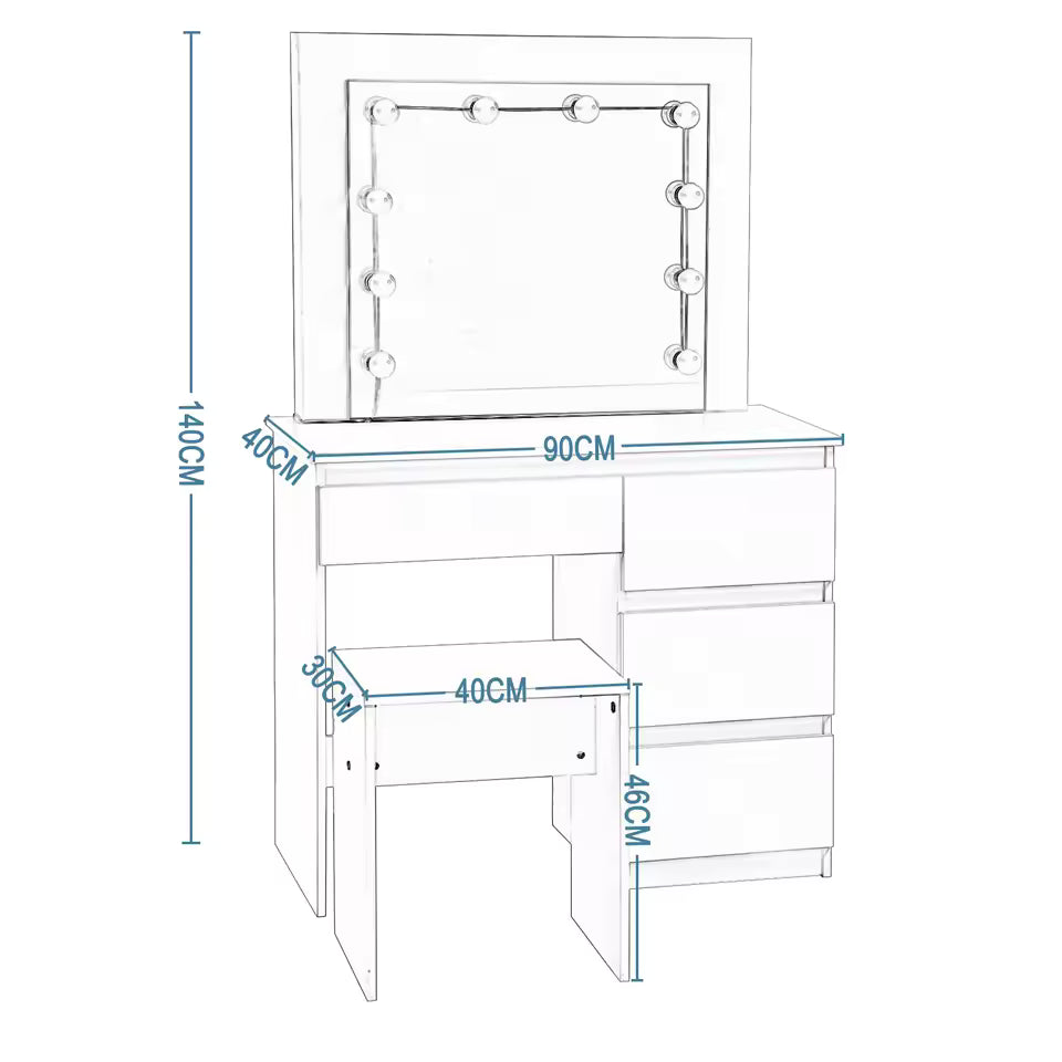 La coiffeuse est fabriquée en panneaux de mélamine E1, de couleur blanche. Ses dimensions sont de 90 × 40 × 140 cm. Le tabouret mesure 40 × 30 × 46 cm. Le poids total est de 43,55 kg. La capacité de charge est de 50 kg pour la coiffeuse et de 100 kg pour le tabouret.